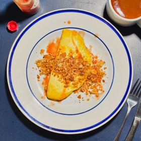 Slide the omelet onto a plate and rub a little more butter on top, to put some gloss on it. Repeat the process with the remaining eggs butter, using 1 Tbsp. per omelet.