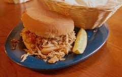 Toast the hamburger buns. Place a level scoop of pig meat on the bottom of the toasted bun. Place pig slaw on top of the meat, then ladle pig sauce over the slaw and meat. Off-set the top part of the bun on top of the sandwich, and serve with onion rings. Serve immediately with a side of cole slaw and your favorite beans.