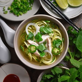 Divide the zucchini noodles among four soup bowls. (If you like softer zoodles, use a mesh strainer to dunk them in boiling water until the desired softness before placing the drained zoodles into the soup bowls.) Top the zoodles with shredded chicken.
