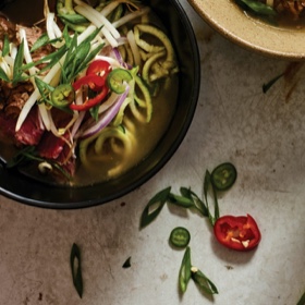 Divide the spiralized zucchini noodles evenly among four large soup bowls. Arrange slices of both raw and cooked beef atop the zucchini noodles, along with slices of red onion and scallion.