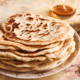 Heat a cast-iron skillet over medium-low heat. No need to oil it as the moufleta will be coated.